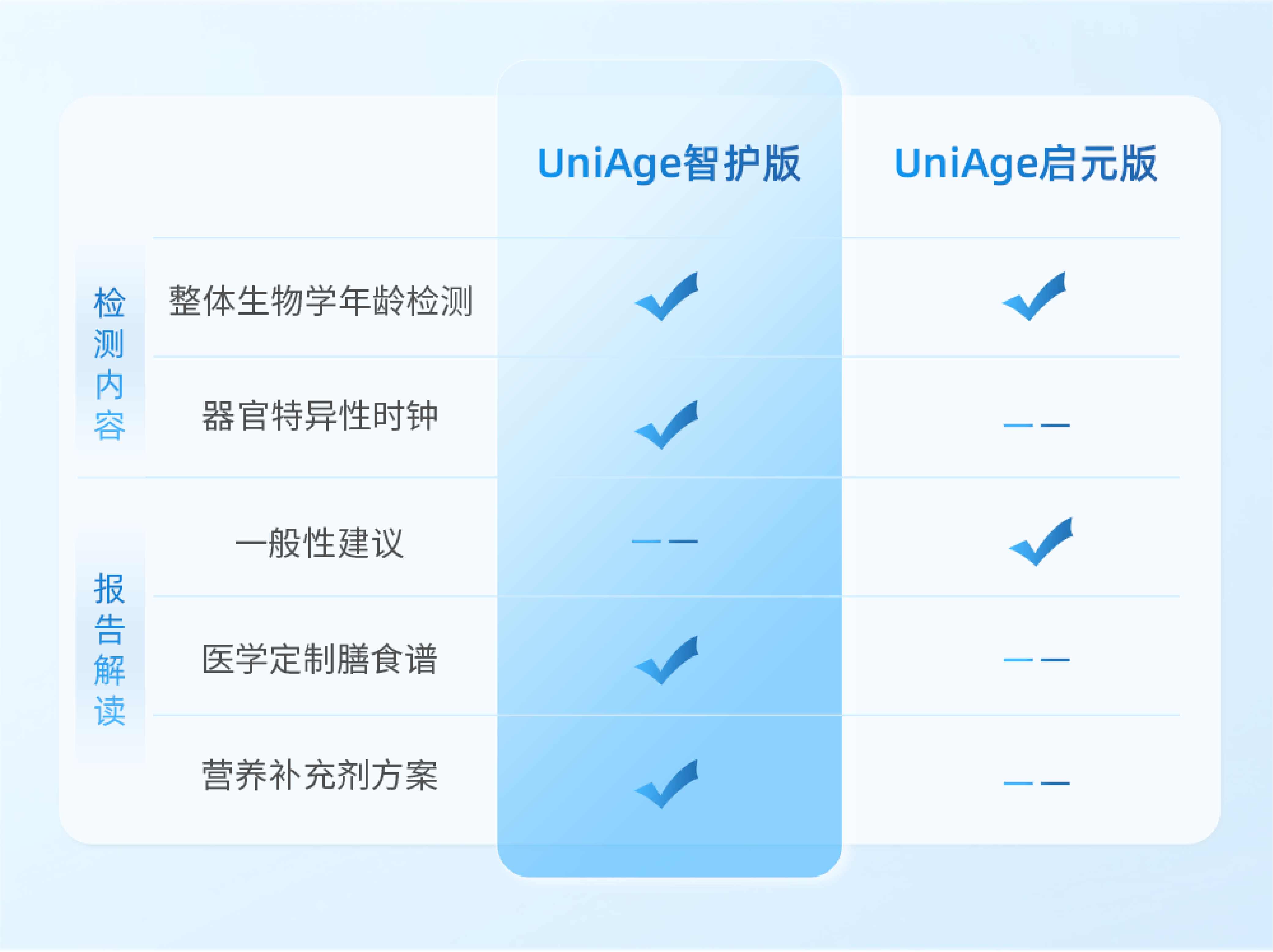 UniAge时钟年龄检测系列产品包含启元版、智护版、尊享版、时光臻礼版,服务呈现“评估维度深化+干预方案丰富+管理闭环完善”的升级逻辑: